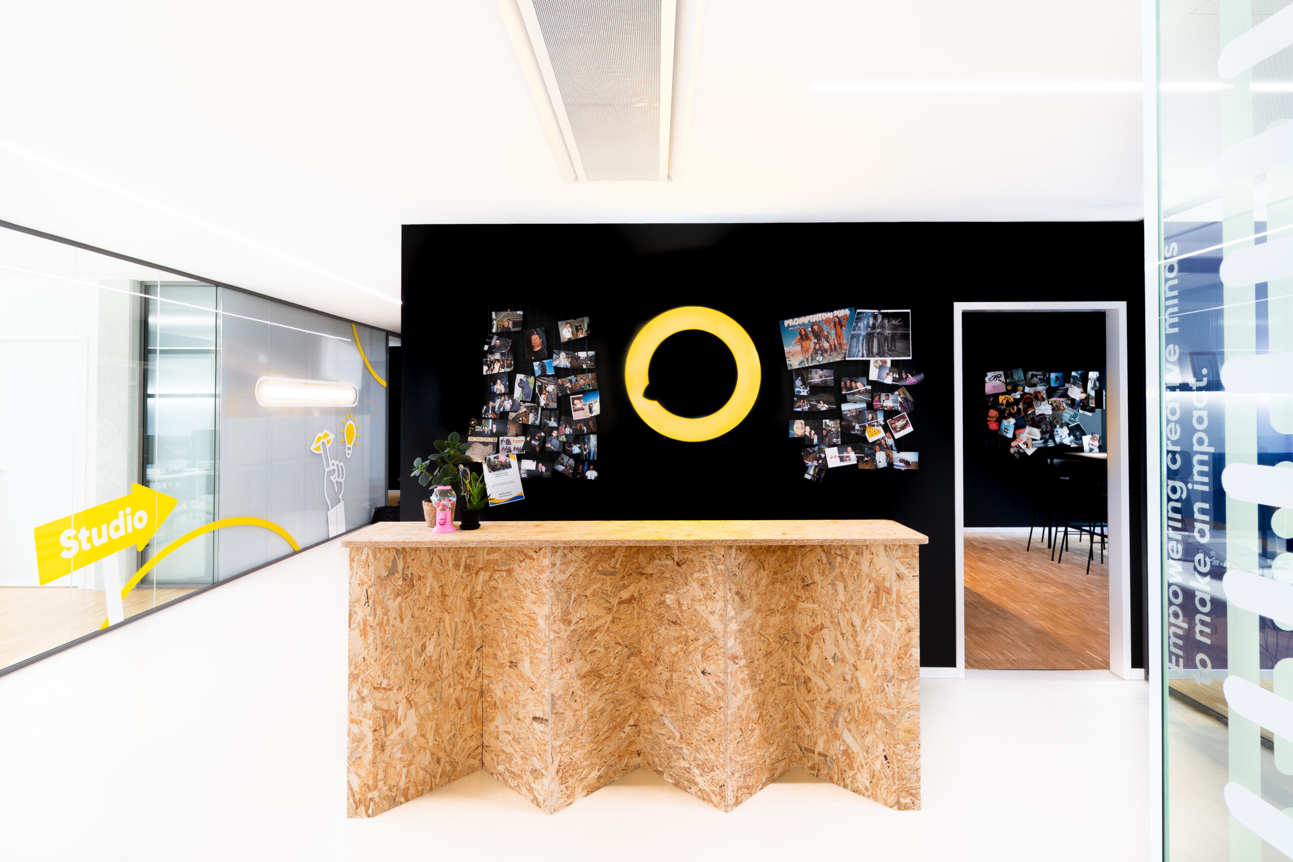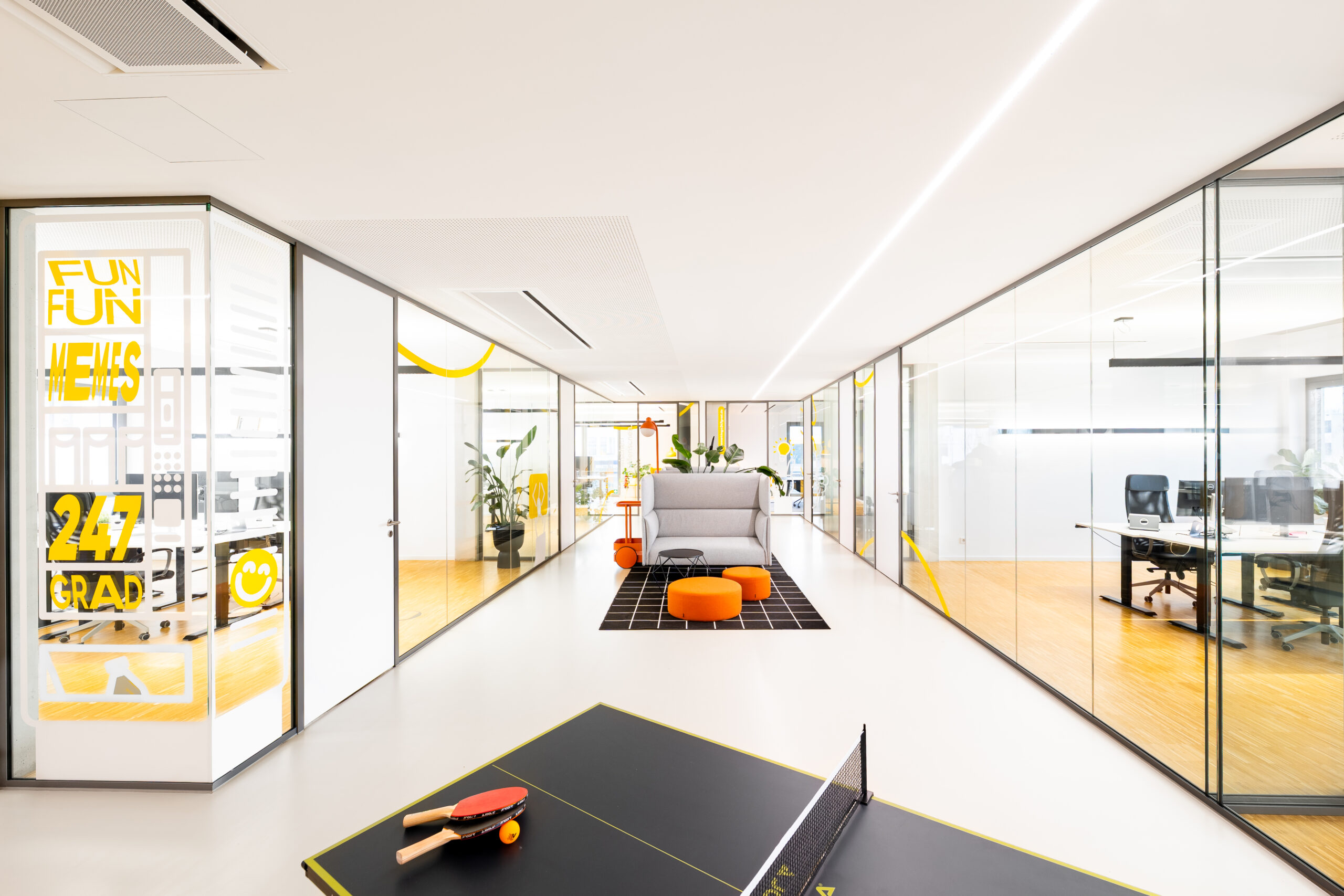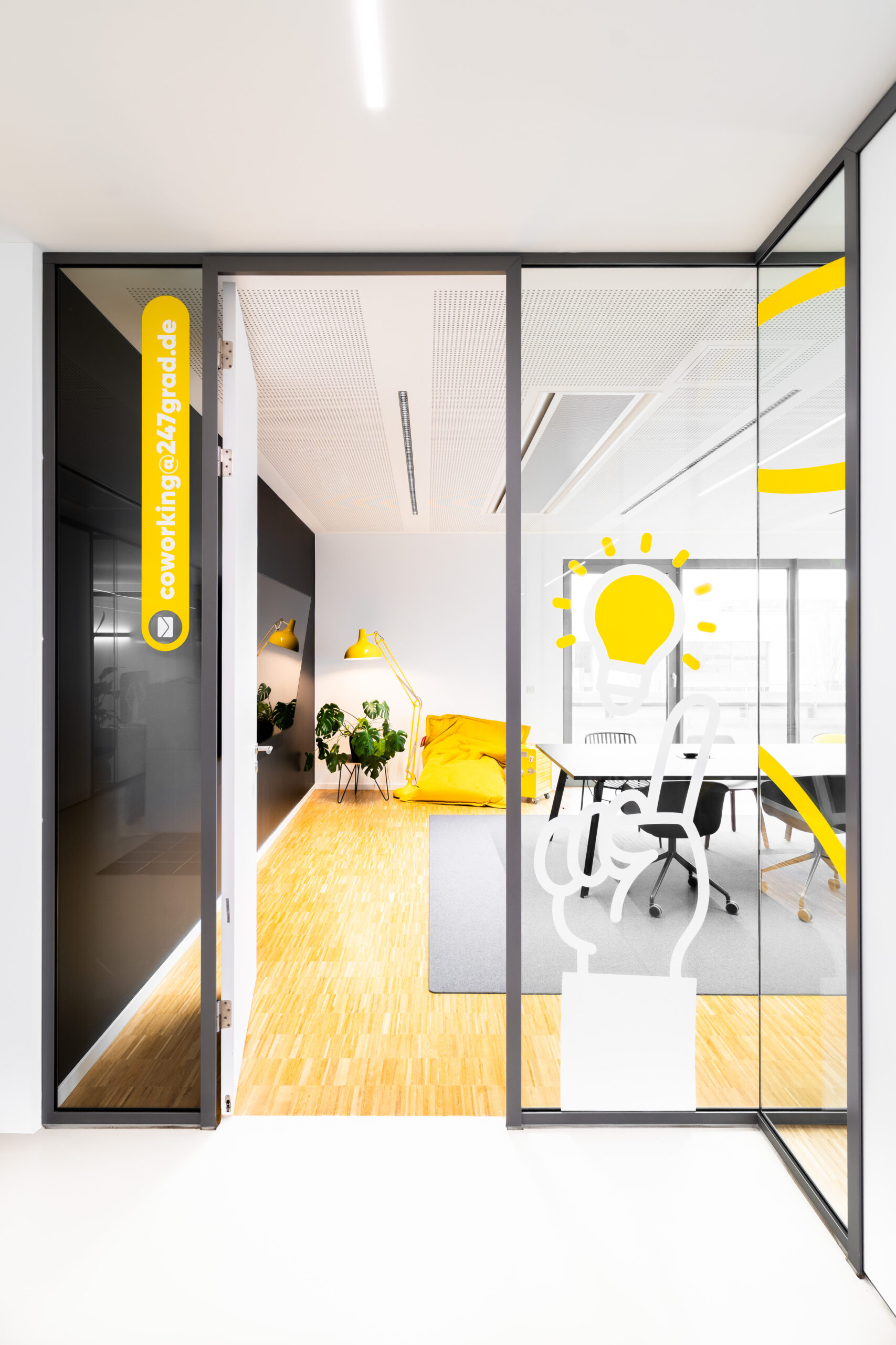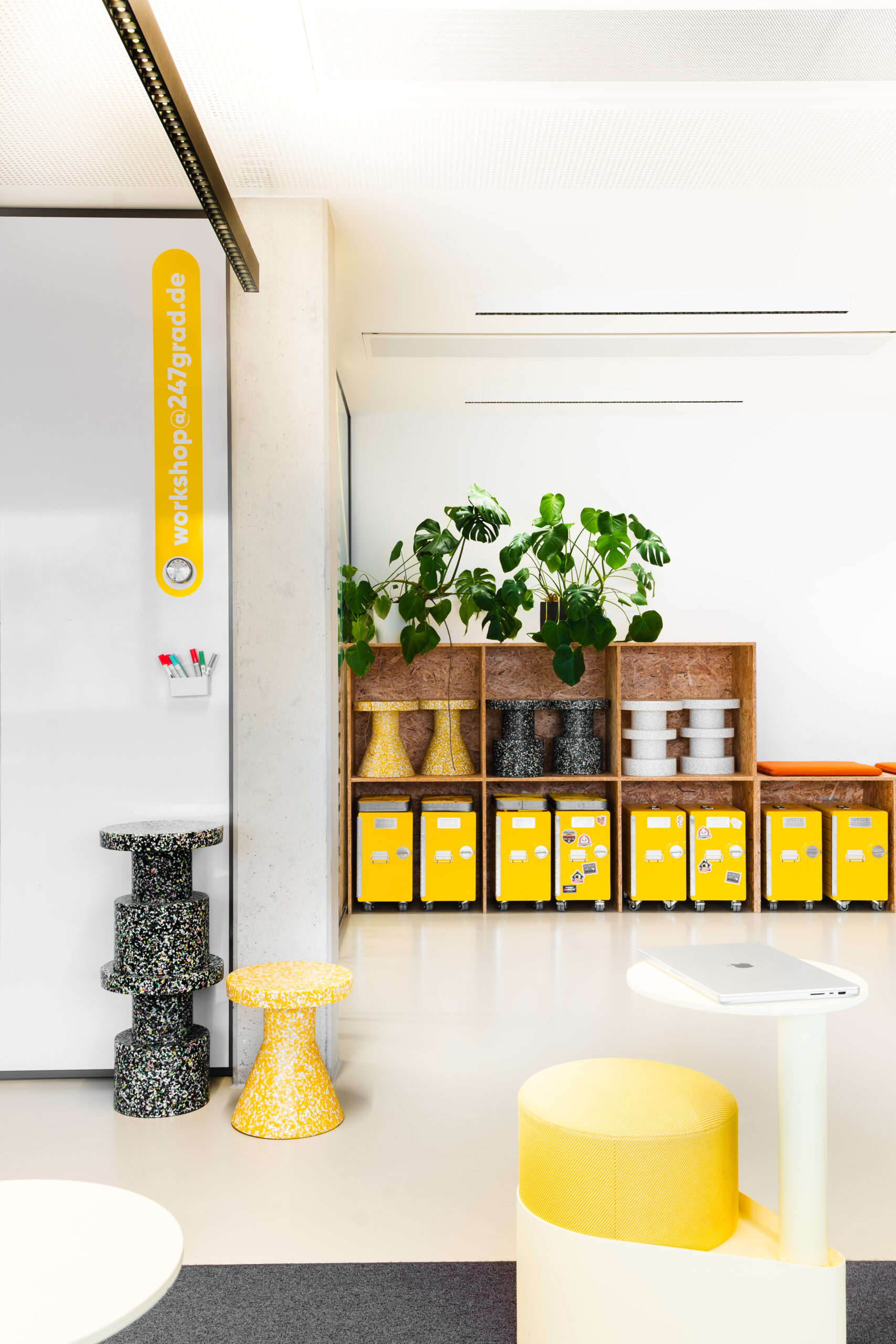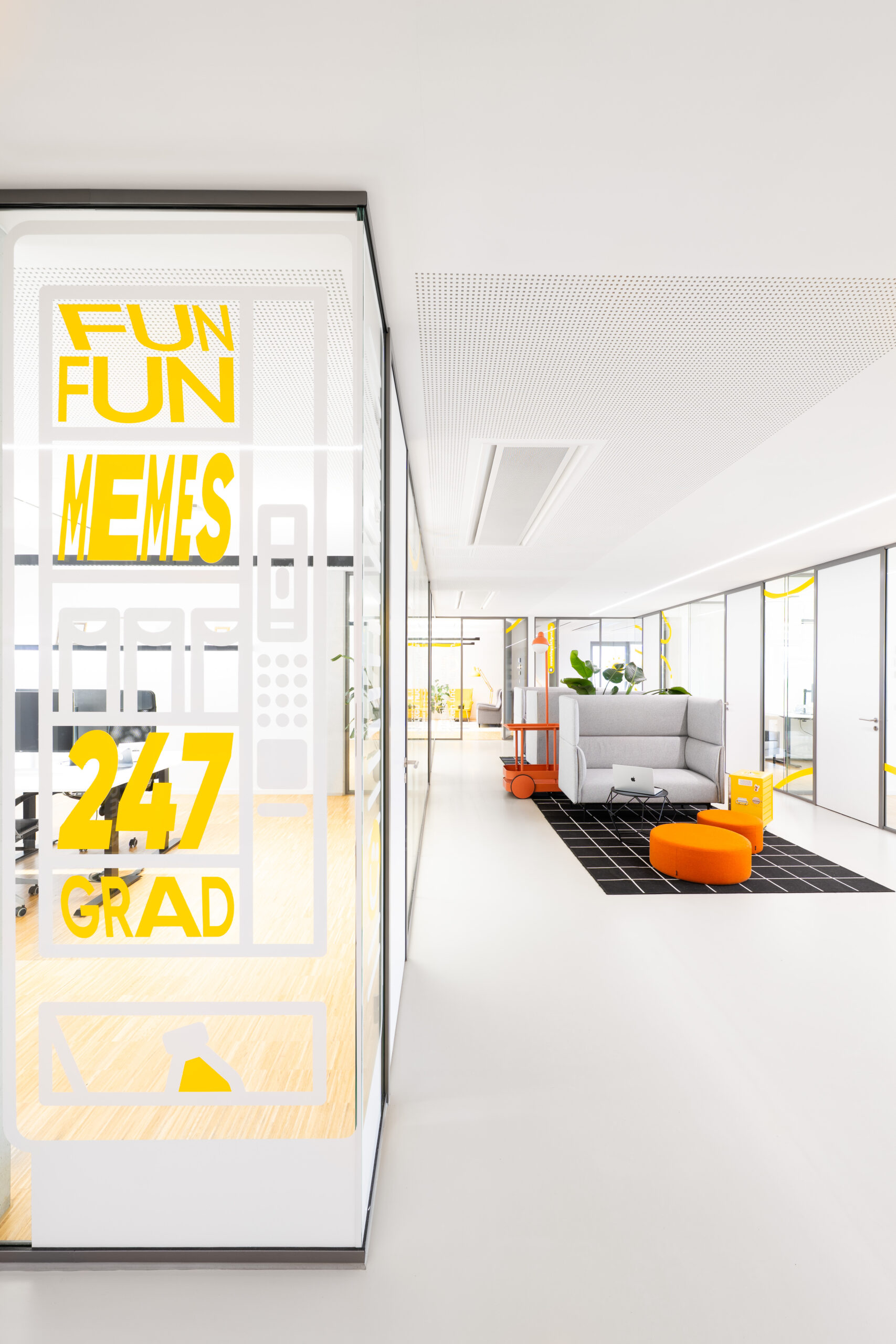 Da die Räume im Neubau bereits vollständig ausgebaut waren, konzentrierte sich das Innenarchitektur Konzept auf gezielte Eingriffe mit hoher Wirkung bei sehr kleinem Budget: neue Lounge- und Meetingbereiche, flexible Möbel sowie farbliche Akzente der Corporate Identity. Eine mobile Minibar, der essentielle knallgelbe Getränke Kühlschrank, Platz für einige Bürohunde und viele kleine humorvolle Details bringen den besonderen Teamspirit von 247GRAD in diese belebte Arbeitswelt.