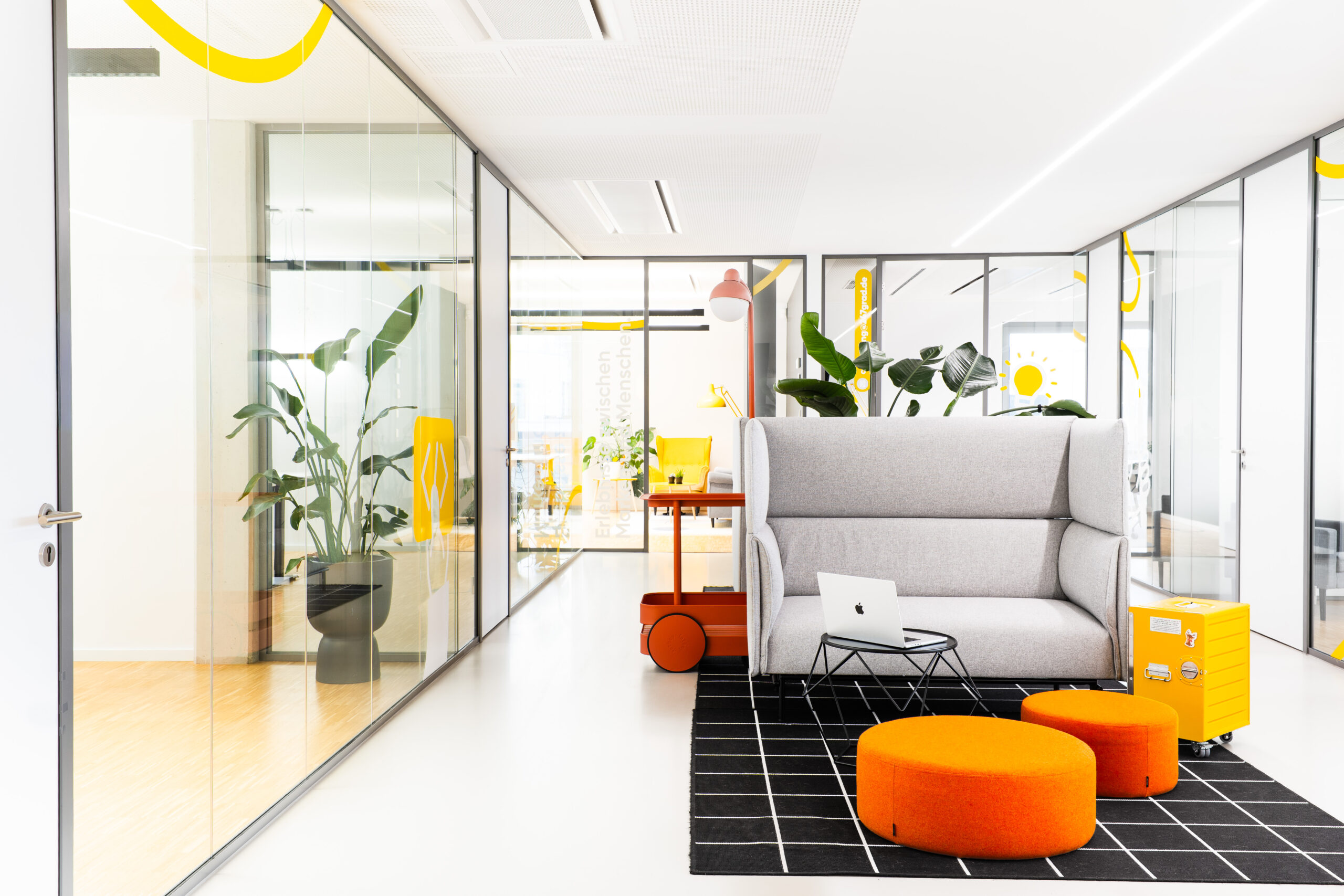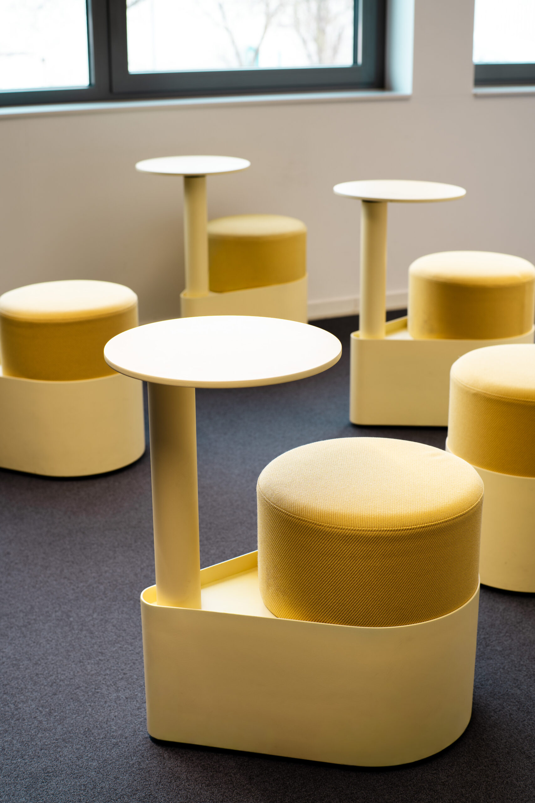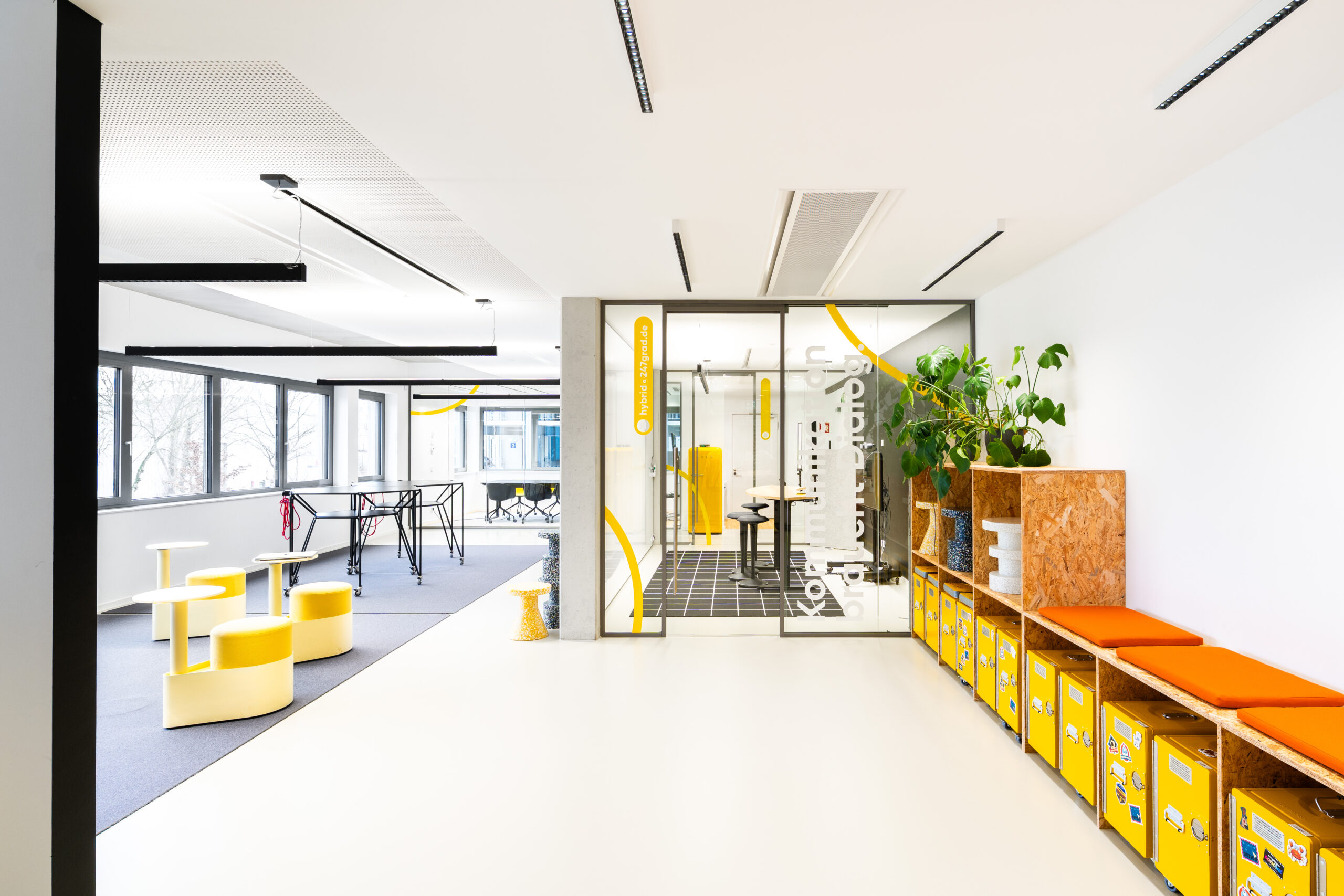 Zentrales Element der Gestaltung sind mobile Rollcontainer (Flightcases) in der Corporate-Farbe Gelb. Die Mitarbeitenden parken diese an einem zentralen Punkt und begleiten sie als persönlicher Stauraum zu wechselnden Arbeitsplätzen im Desksharing-Modell. Jeder Container kann individuell gestaltet werden – und wird so zum kleinen Ausdruck der eigenen Persönlichkeit mit Stickern, Gimmicks, Sitzkissen uvm. Gleichzeitig lassen sich die Möbel spontan zu kleinen Meeting-Setups zusammenschieben und unterstützen die agile Arbeitsweise des Teams. Genauso wie die mobilen gelben Meeting-Ponies – verspielte Möbel mit kleinen Tischen für spontanen Austausch.