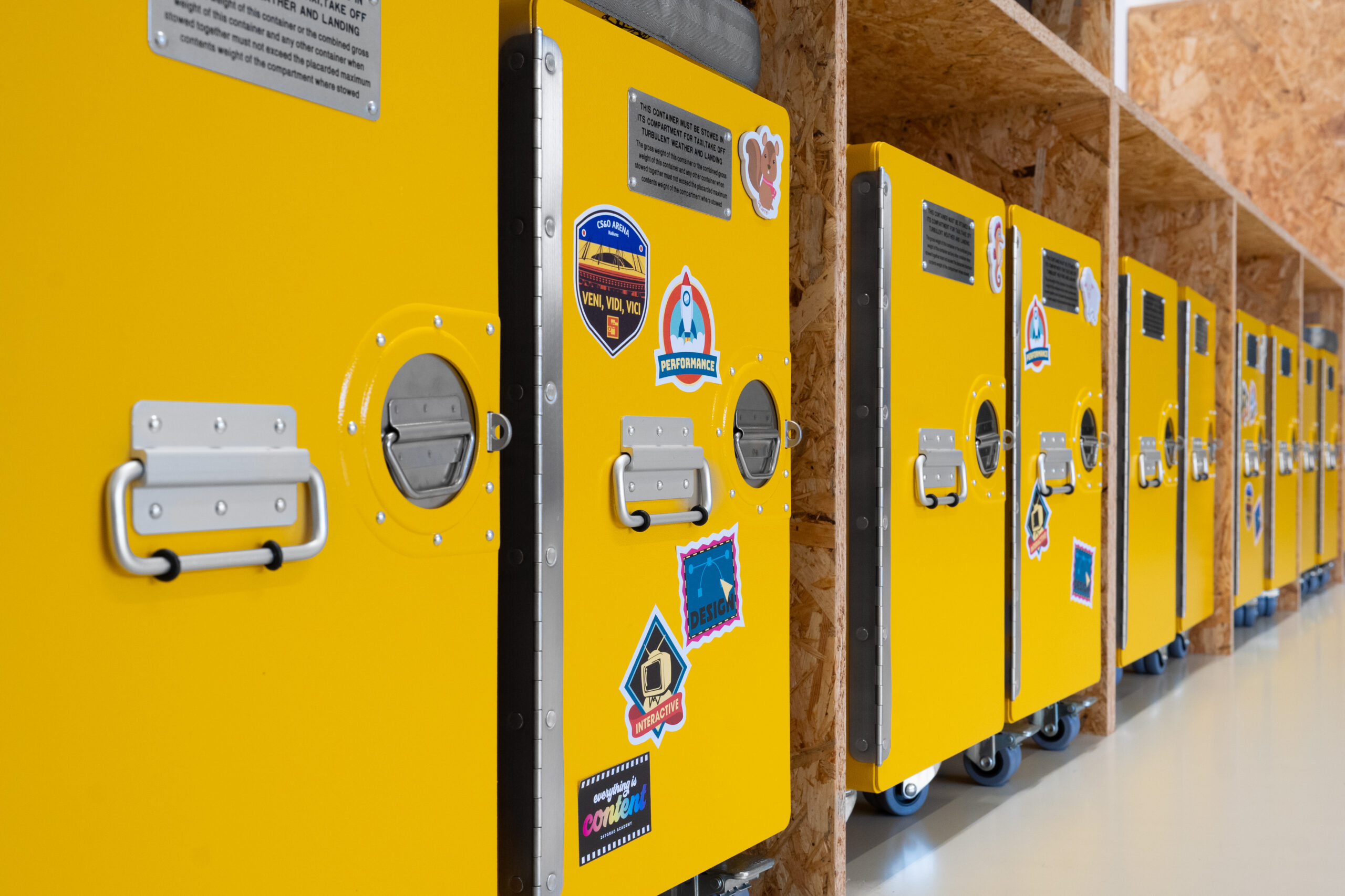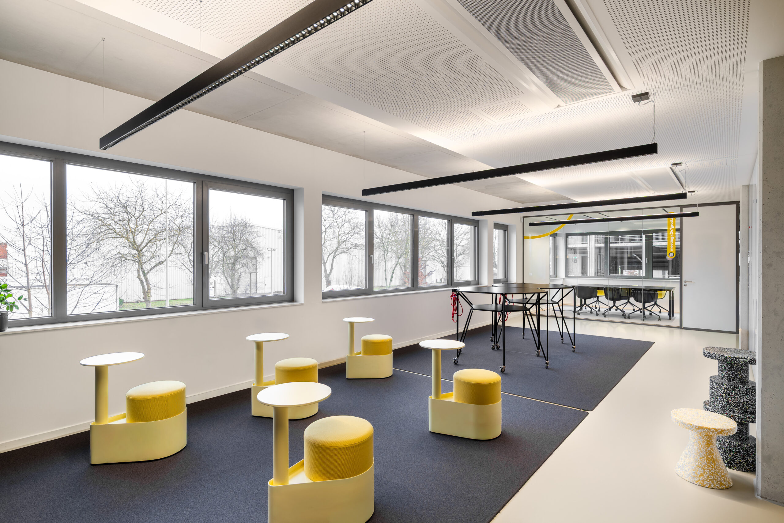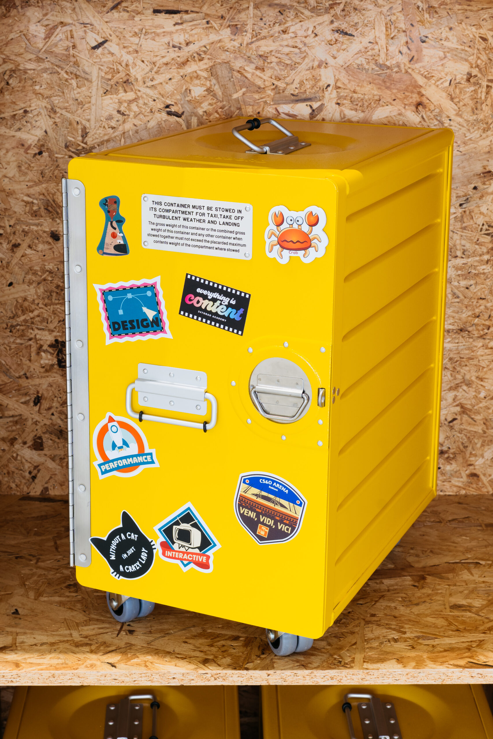 Zentrales Element der Gestaltung sind mobile Rollcontainer (Flightcases) in der Corporate-Farbe Gelb. Die Mitarbeitenden parken diese an einem zentralen Punkt und begleiten sie als persönlicher Stauraum zu wechselnden Arbeitsplätzen im Desksharing-Modell. Jeder Container kann individuell gestaltet werden – und wird so zum kleinen Ausdruck der eigenen Persönlichkeit mit Stickern, Gimmicks, Sitzkissen uvm. Gleichzeitig lassen sich die Möbel spontan zu kleinen Meeting-Setups zusammenschieben und unterstützen die agile Arbeitsweise des Teams. Genauso wie die mobilen gelben Meeting-Ponies – verspielte Möbel mit kleinen Tischen für spontanen Austausch.