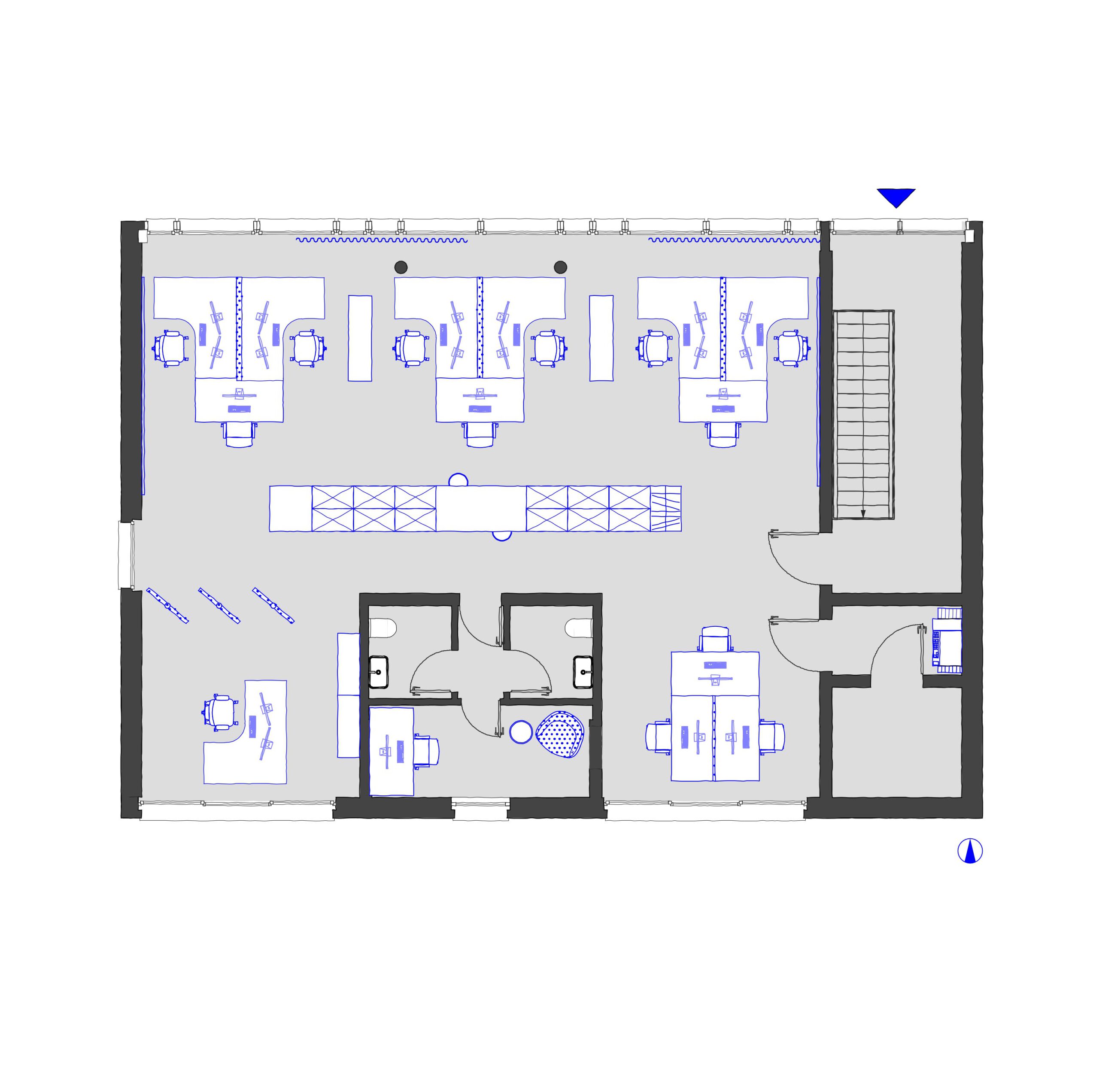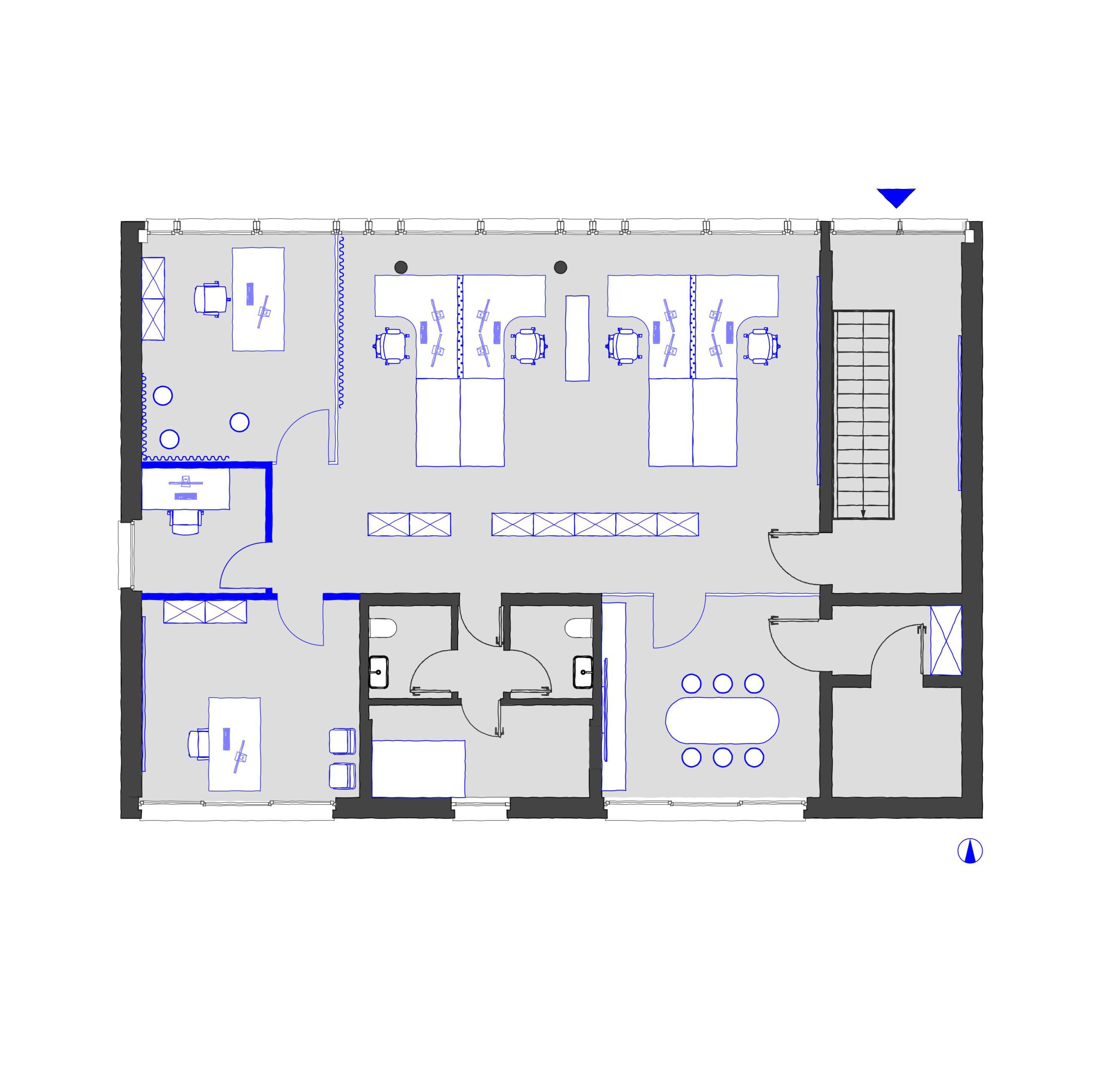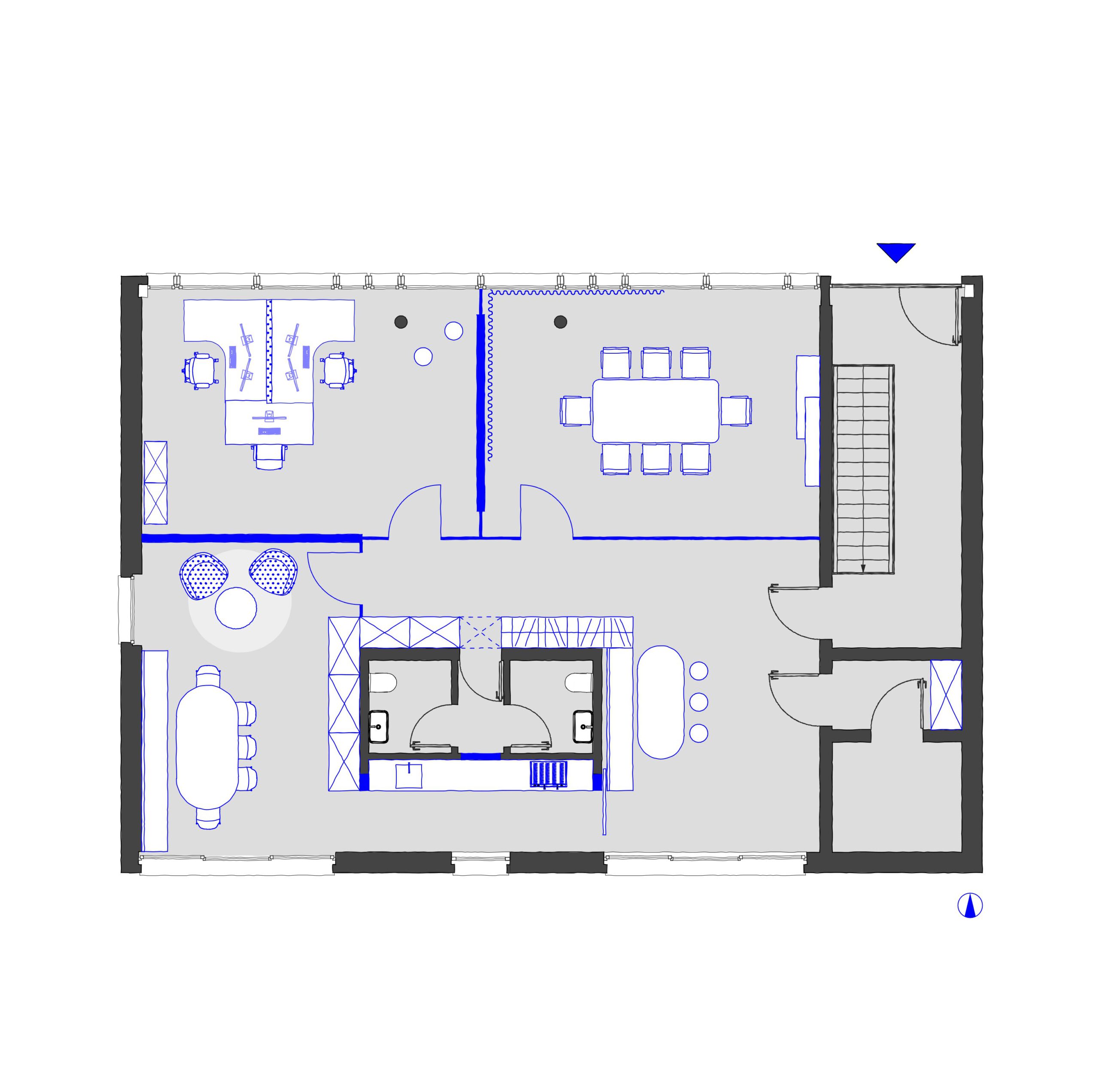 New Work für neue Projekte in einem kompakten Gebäude auf drei Etagen. Highlight und verbindendes Element wird ein lila Kubus, der mal Küche, mal Empfang, mal Stauraum und mal zonierendes Element auf allen Ebenen ist. Die Arbeitswelt um den Kubus ist geradlinig und zurückhaltend und bietet neue Orte zwischen Kollaboration und Konzentration.
