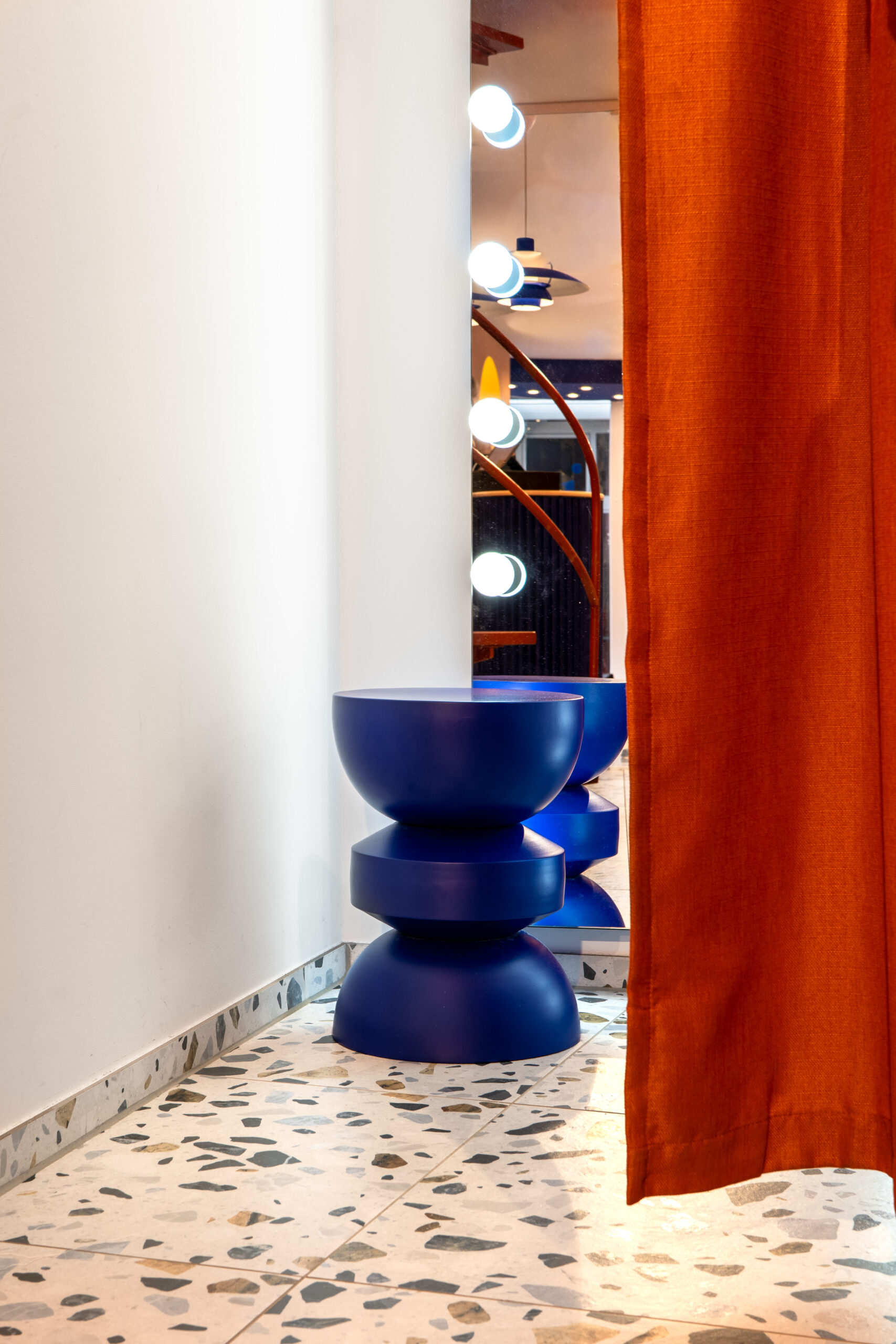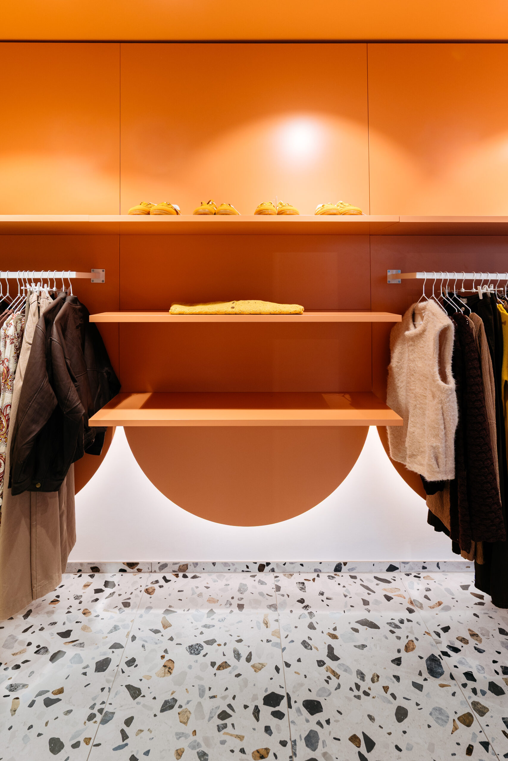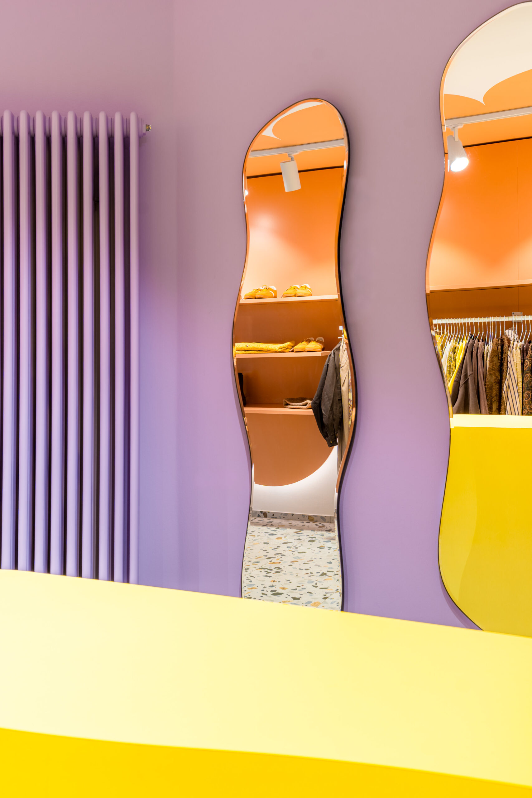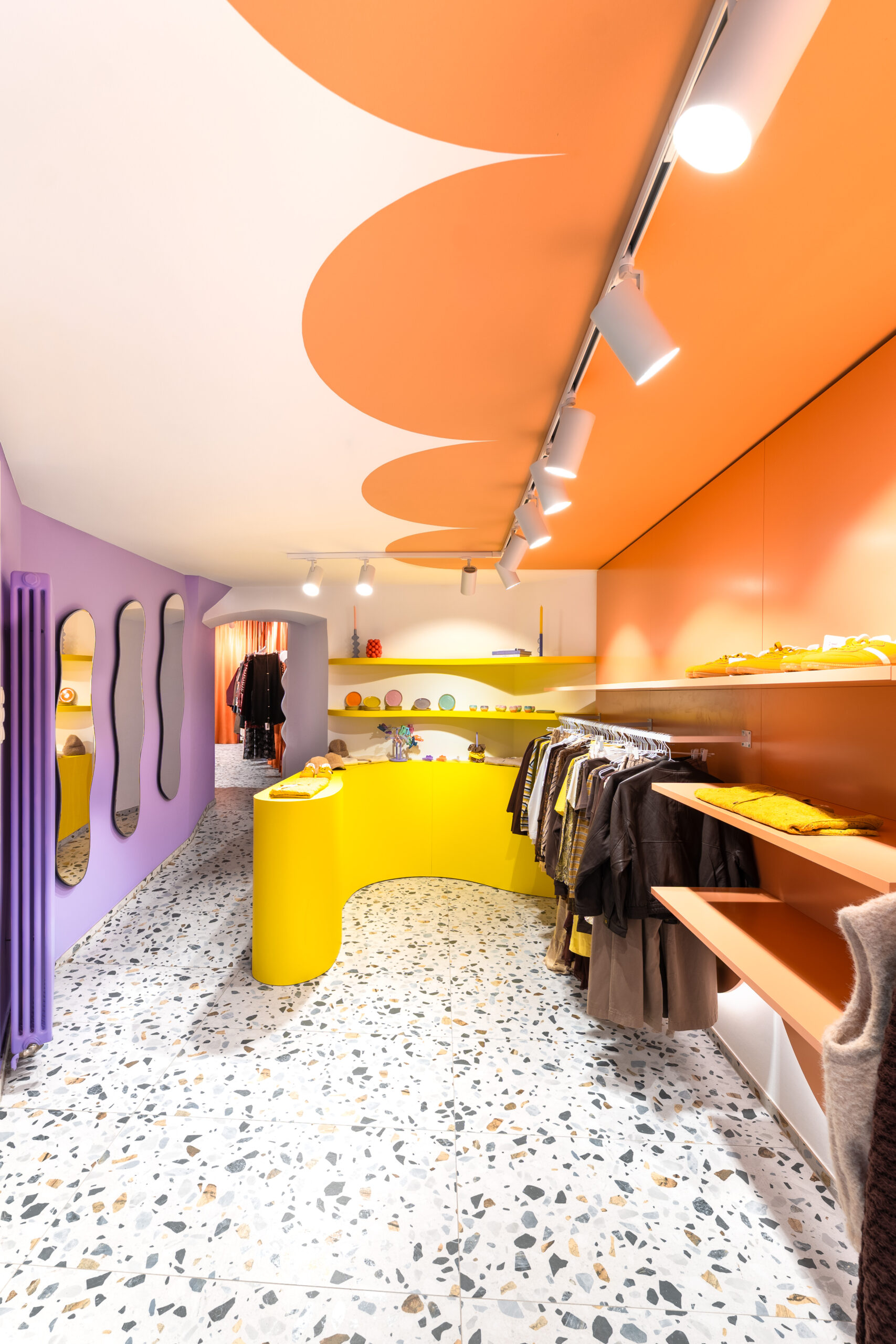 Das Herzstück des Entwurfs bildet die Farbgestaltung: Eine frische, lebendige Palette aus Pastelltönen sowie kräftigen Akzenten in Kombination mit monochromen Flächen prägen das Raumerlebnis. Ergänzend dazu verleihen Rundbögen, Rundungen und Freiformen dem Raum eine organische, fließende Dynamik, die die Strenge klassischer Ladenarchitektur aufbricht.